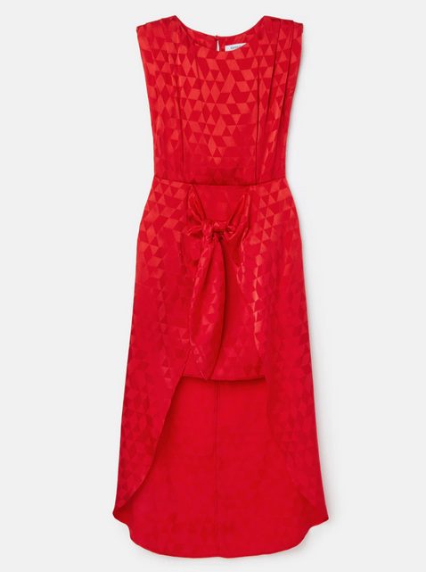 El rojo viene con fuerza esta temporada, y otro diseño precioso en este color es este modelo también de la marca Fórmula Joven. Tiene un estampado tipo jacquard en el mismo tono, y es un vestido sin mangas y con cuello tipo barco. El toque único y original se lo da la falda, que se compone de una pieza corta y una especie de capa larga por detrás que va anudada a la cintura. Una prenda tan elegante como llamativa con la que destacarás sin dudas. Tiene un precio de 69,99€ y lo puedes conseguir aquí.