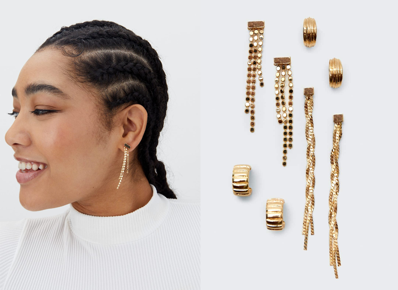Antes de hablar del collar múltiple de Stradivarius que parece de oro y de otras novedades en accesorios y complementos de la cadena de tiendas perteneciente al grupo Inditex, tenemos que mencionar este set de pendientes largos y aros fantasía.
