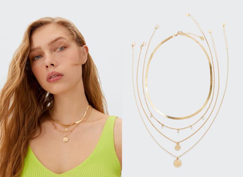 El collar múltiple de Stradivarius que parece de oro y que se vende por tan solo 7,99 euros es este set de cuatro collares de medallas y cristales, un paquete de cuatro modelos de collares diferentes con los que poder conseguir el accesorio ideal para tus outftis.