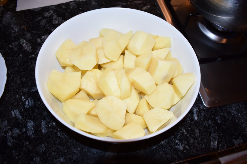 Con el bacalao ya casi a punto, llega otro de los momentos más importantes de esta receta: el de preparar las patatas. Pélalas y córtalas después en cubos o rodajas, como más te guste. En este punto, puedes optar tanto por freírlas como por hervirlas y, más tarde, reserva para más adelante. Como consejo, hervir las patatas supondrá restarle calorías y aumentar los beneficios de esta exquisita elaboración de pescado.
