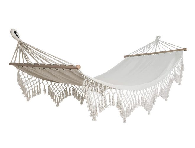 Si quieres darle un toque exótico a tu terraza, anímate con una hamaca colgante. Esta de El Corte Inglés es de poliéster y algodón, suave y a la vez resistente, con detalles de flecos decorativos. Es muy fácil de colgar, y cuenta con dos travesaños de madera que le da más consistencia y estabilidad. Es de color natural y mide 100 (ancho) x 200 (largo) cm. También se puede colocar en una estructura específica para hamacas, que se adquiere por separado. Cuesta 54,90€ y la puedes comprar aquí.