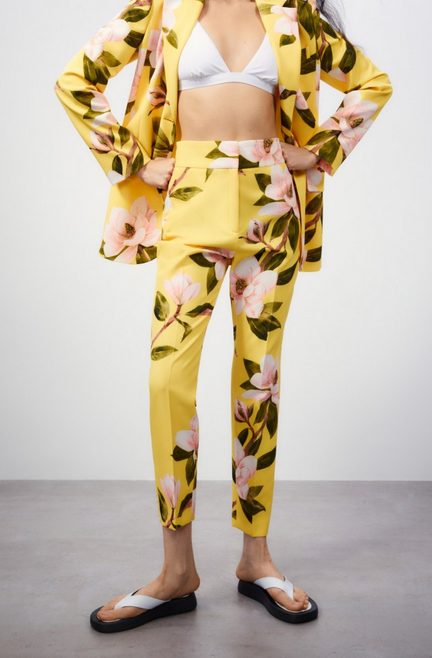 Las flores vienen con fuerza, y aunque suelen ser habituales en vestidos o blusas, Sfera las coloca en los pantalones. Se trata de una prenda muy original con la que marcarás estilo allá a donde vayas. La forma del pantalón es recto, y cierra con gancho y cremallera. El estampado es de grandes flores sobre fondo amarillo. Puede ser tuyo por 35,99€ y si quieres el traje completo puedes llevarte la blazer a juego para un total look con el que no pasarás desapercibida. Si te gusta entra en este enlace.