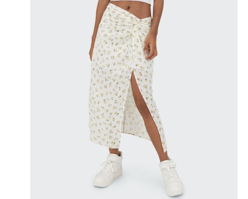 Veamos ahora una falda. Combinar prendas de carácter más elegante con otras de estilo casual es la máxima de esta nueva colección de Stradivarius. Por eso, una de las prendas que más llama la atención y con las que más fácil se puede conseguir este efecto es esta falda de corte midi y detalle de nudo que cuenta con un romántico estampado que combina con todo. Además, la tienes disponible por solo 22,99 euros. Sin duda, una gran inversión.