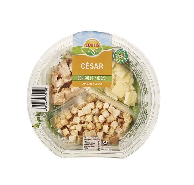 Otro preparado de esos para momentos de prisa que Lidl pone a nuestra disposición, es la ensalada César. Lleva lechuga, pollo, quesos cheddar y gouda, y picatostes de pan. Si tienes 2 minutos puedes añadirle algunos ingredientes para darle tu toque, o simplemente comértela tal cual viene. Esta semana tiene un descuento de 22% y te puedes llevar la ración por 1,55€.