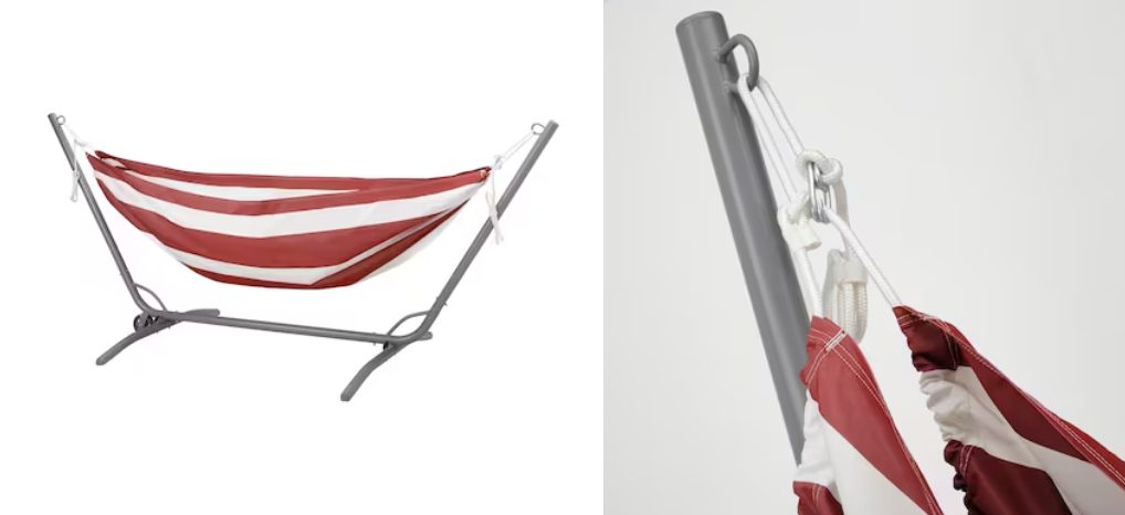 Si quieres tener un lugar de retiro exterior que destaque y sea especial al de los demás, no puede faltar una buena hamaca sobre la que poder relajarte durante las tardes de verano. Esta, de Ikea, cuenta con estampado de rayas blancas y rojas y viene incluso con su propio soporte por tan solo 115 euros. No te podrás resistir.