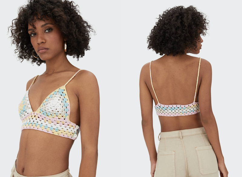 A la venta por 15,99 euros, se trata de un bralette crochet de colores que posee escote pico y tirante fino. Es un modelo interesante que combina fácilmente tanto con pantalones cortos como largos, faldas….