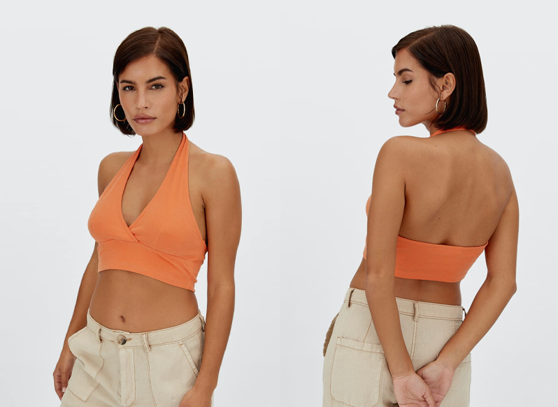 Es un top de cuello halter cruzado en el cuello que se encuentra confeccionado en una mezcla de 97% de algodón y 3% de elastano. Este modelo se encuentra disponible a la venta por 9,99 euros.