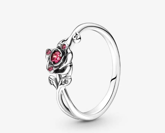 Este anillo de Pandora, está inspirado en la icónica rosa de la película de Disney, y se lleva a cabo de una forma muy especial con circonitas cúbicas en color rojo, rodeadas con hojas y gemas rojas más pequeñas.