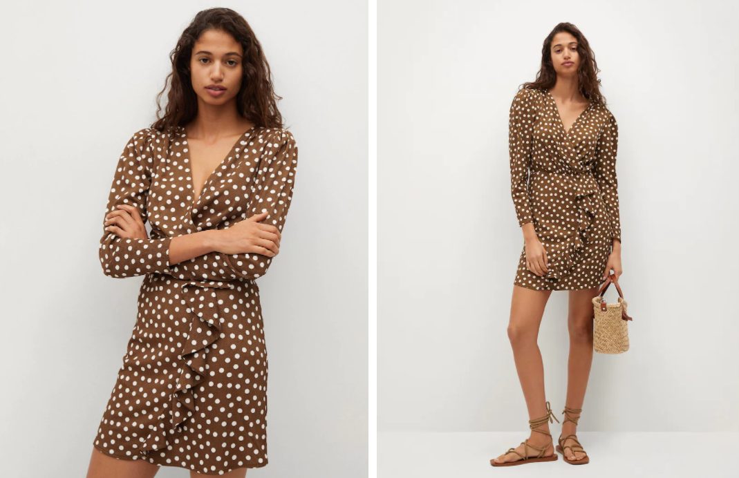 Al más puro estilo «Pretty Woman», podemos encontrar ya en su tienda online este vestido de base en color marrón con lunares blancos que cuenta con detalles tan elegantes como su escote en pico y su volante frontal.