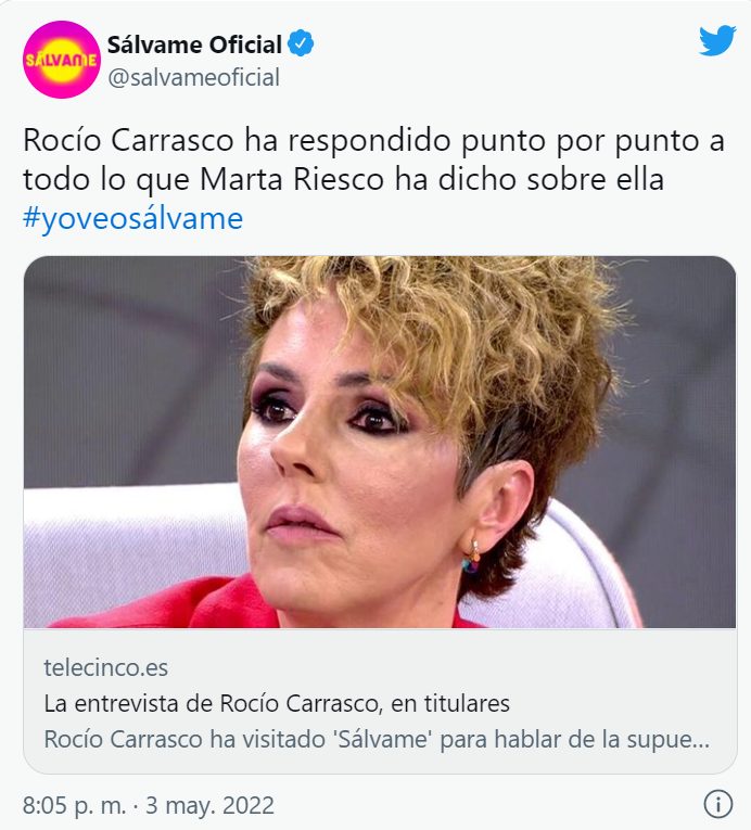 Una vez que terminó el fin de semana y el programa «Viva la vida» la cosa no quedaba ahí. El siguiente lunes, era la propia Rocío Carrasco quien se presentó en «Sálvame» para confirmar o desmentir la información de Marta Riesco. Así, afirmaba que: «Yo no he hablado jamás con esta chica. Es la novia digna del ser. Pobrecita. A mí en el fondo me da pena. La pena y el fastidio es que yo me tenga que ver en la tesitura de defenderme de algo que es mentira».