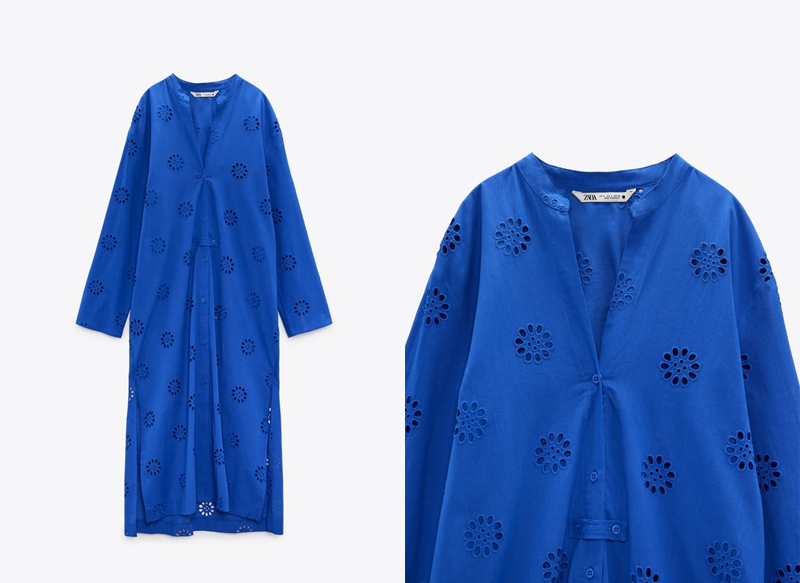 Es un vestido túnica de cuello redondo y escote pico que tiene manga larga y detalle de bordados perforados combinados a tono. Dispone de un bajo acabado en aberturas laterales, así como un cierre frontal con botones.