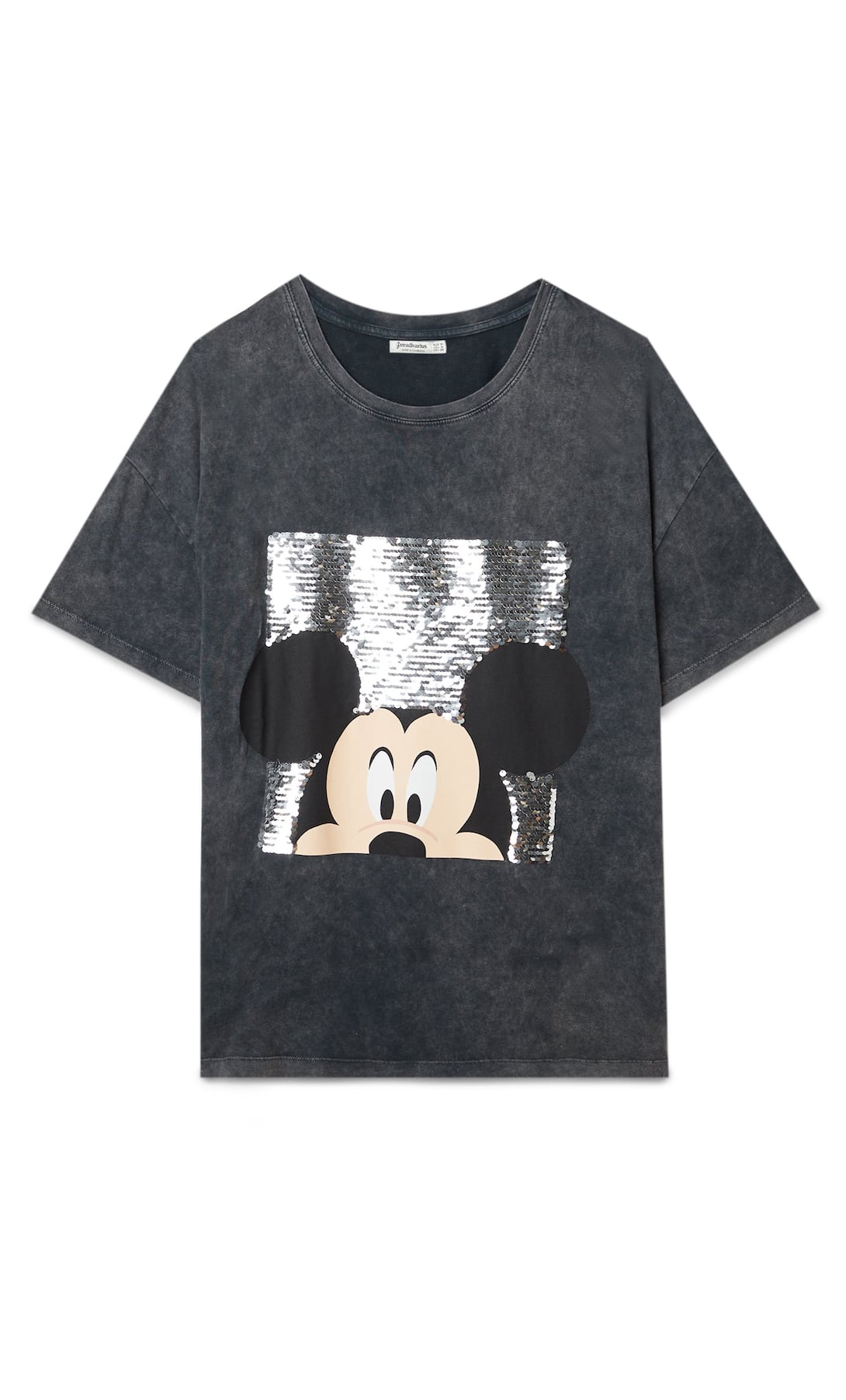 En este caso, tenemos la imagen de Mickey, el ratón más famoso del mundo, en el frontal de una camiseta negra, con llamativos detalles de lentejuelas. El diseño es tipo T-shirt, con cuello redondo y manga corta. Fabricada en 100% algodón, cuesta 15,99 €.