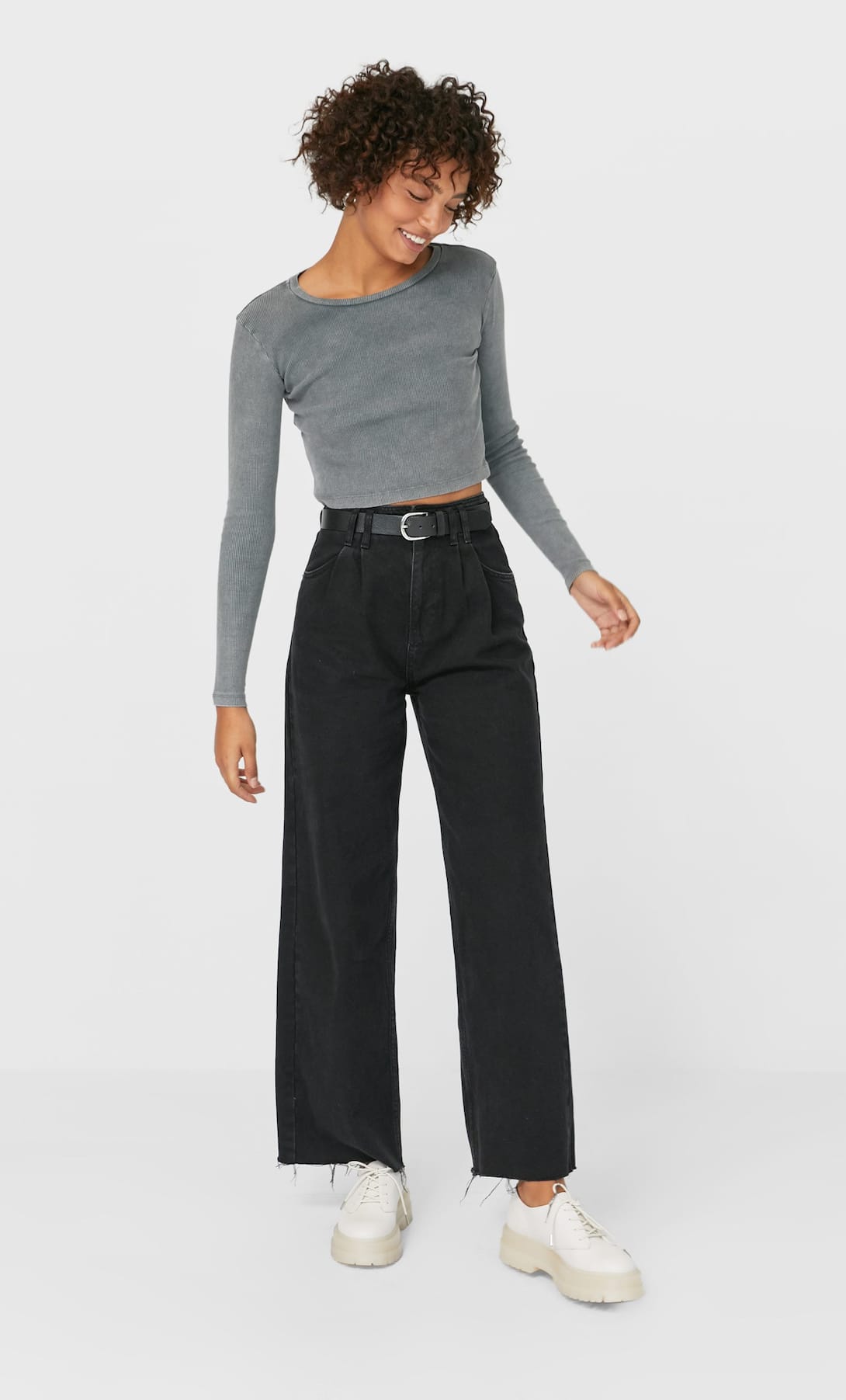 Un buen ejemplo es esta camiseta tipo crop de manga larga y cuello redondo, fabricada en 100% algodón con efecto lavado o desgastado. Se puede combinar con cualquier cosa y añadirle capas de ropa encima los días de frío. La encontraremos en cuatro colores diferentes: gris mezcla, lila, piedra y gris perla, por solo 9,99 €.