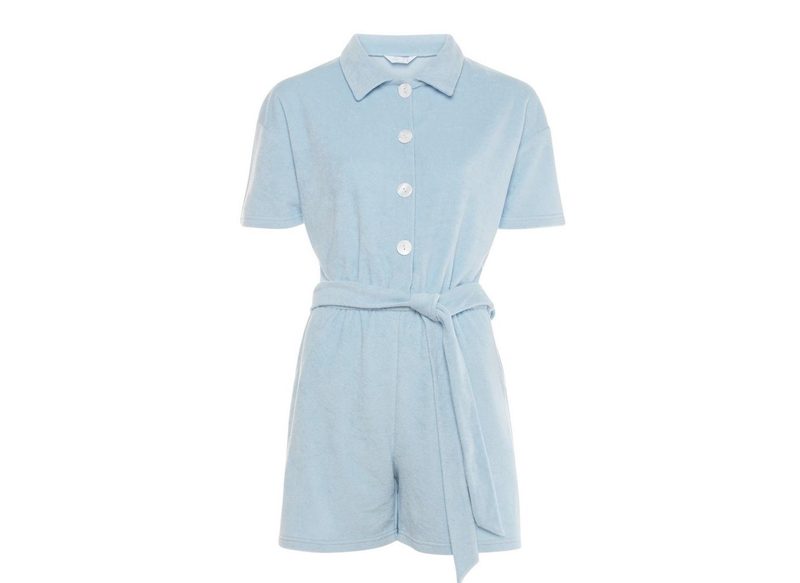 Este mono corto azul de rizo con cinturón es una de las prendas más interesantes que se pueden encontrar en el catálogo actual de la marca irlandesa. Se vende por solo 15 euros y nada tiene que envidiar a los modelos de marcas de lujo.