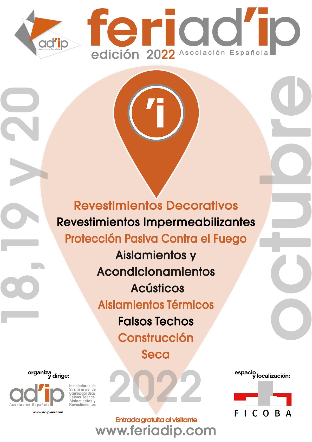FERIAD’IP, en su segunda edición, se consolida como el mayor punto de encuentro del sector, donde se expondrá toda la actualidad e innovación relacionada con los Sistemas de Construcción Seca, Falsos Techos, Aislamientos Térmicos, Aislamientos y Acondicionamientos Acústicos, Protección Pasiva Contra el Fuego, Revestimientos Impermeabilizantes y Revestimientos Decorativos, tanto para interiores como para la aplicación en envolventes, como el SATE, con soluciones para rehabilitación y obra nueva, junto con Herramientas adecuadas para la Instalación, como Nivelación, Sistemas de Fijación, Corte, Proyección o Pulverización, Elevación y Prevención de Riesgos Laborales.