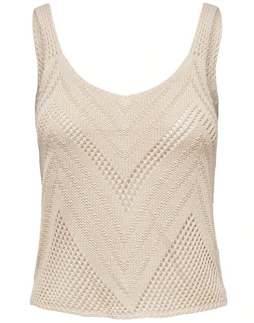 El tejido de crochet es otra tendencia que no podemos ignorar y que debe estar presente en nuestro armario. En El Corte Inglés hemos visto este top de tirantes de la marca JDY, con cuello redondo y tejido de punto tipo crochet.