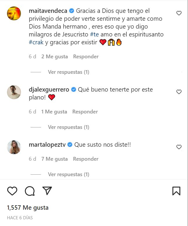 Algunos de los mensajes son de carácter más animado, uniéndose a la gran celebración, como: «¡Qué bueno tenerte por este plano!». Otros, sin embargo, recuerdan el momento exacto en el que se enteraron del accidente afirmando que se llevaron «un gran susto». No obstante, todos coinciden en celebrar la vida del ganador de «Gran Hermano» así como su gran fuerza a la hora de continuar adelante.