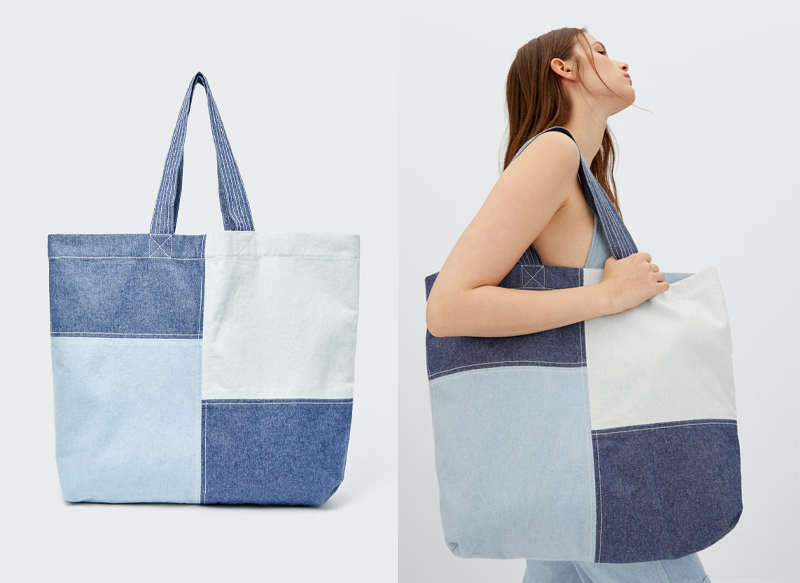 Además de prendas de ropa, en el catálogo de Stradivarius podemos encontrar novedades en complementos como este bolso tejano Waste con un diseño elaborado con diferentes tonos de azules, dándole así un aspecto moderno y actual.