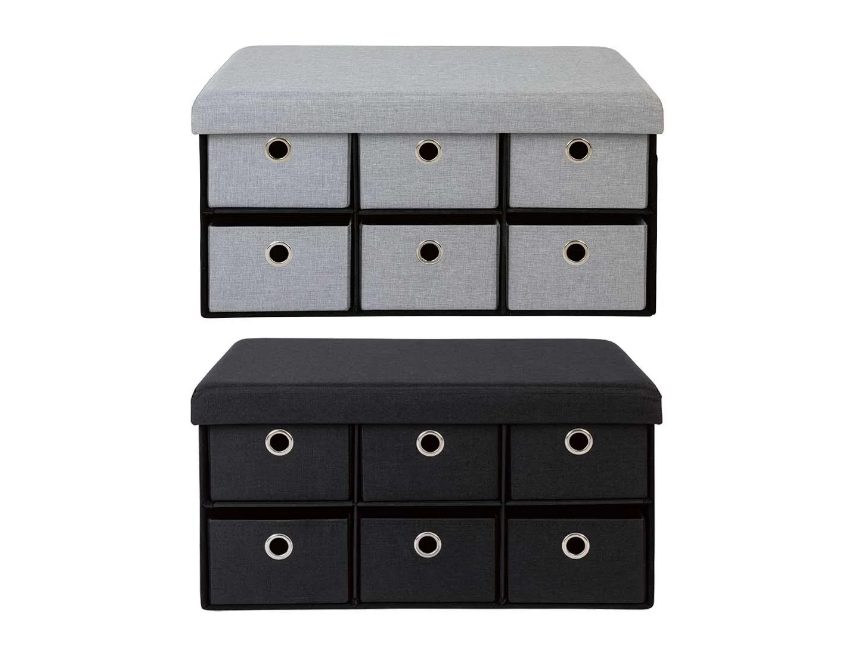 En Lidl podemos encontrar distintos modelos de banco de almacenaje, un tipo de mueble 2 en 1 sumamente práctico y a la vez decorativo. Este modelo en concreto tiene unas medidas de 76 x 38 x 38 cm y cuenta con 6 cajones frontales muy espaciosos. En la parte superior tiene un asiento acolchado que se puede extraer. Hay dos sueños, uno en gris oscuro, y otro en gris claro. Soporta una carga máxima de 110 kg. Ideal para colocar en el salón, en el dormitorio o en una habitación infantil. Se monta fácilmente sin herramientas y cuesta 34,99€.
