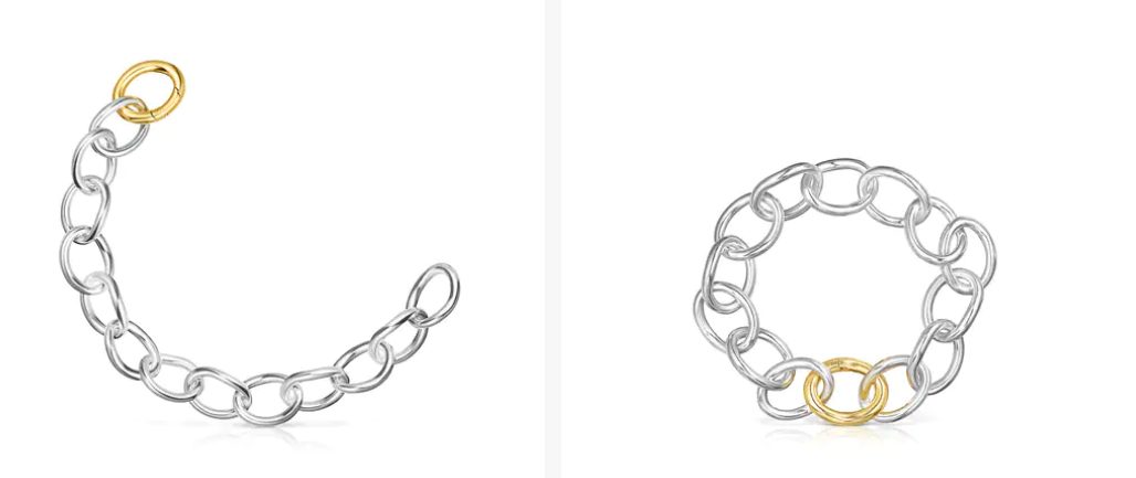 Los accesorios elegantes y sofisticados destacan como una de las propuestas de Tous de cara a esta temporada de calor. En este caso, llama la atención esta pulsera de anillas bicolor, en plata y dorado, cuya mezcla hará resaltar todos tus conjuntos. Cuenta con un precio de 289 euros. Sin embargo, será una inversión para toda la vida.