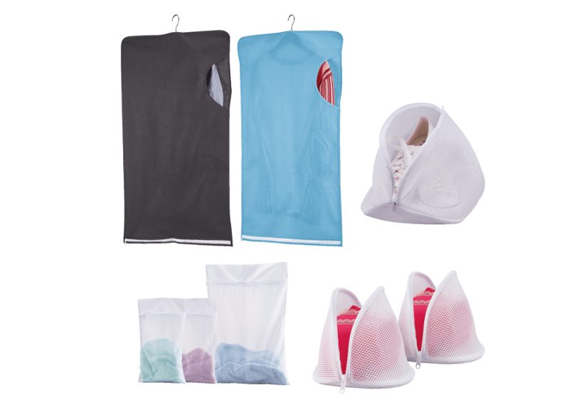 Fabricadas en 100% poliéster, sirve para lavar prendas licadas o para organizar la ropa en la maleta, estando disponible en diferentes formatos: red para lavar los zapatos; bolsa de viaje para ropa sucia; set de tres redes para lavar ropa; y pack de dos redes para sujetadores.