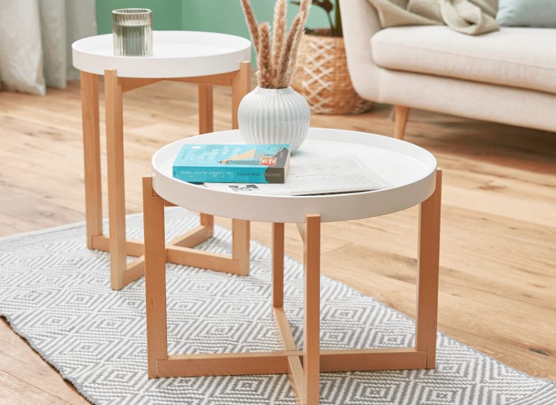 Otra opción muy interesante para la decoración del hogar es esta mesa de diseño Home Creation. Se trata de una mesa auxiliar con bandeja extraíble que cuenta con patas de madera maciza de haya.