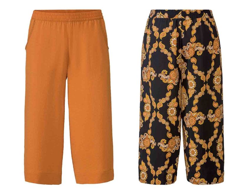 Si buscas un pantalón ligero, cómodo y estiloso, el culote de Lidl es perfecto para ti. Es de tejido agradable y fresco, lleva bolsillos laterales y una cintura elástica muy cómoda. El diseño es moderno con un largo 3/4 y un corte ancho y muy fluido. Tiene un 2% de elastano para un juste perfecto. Hay tallas desde la 38 a la 48, y puedes elegir entre un modelo estampado y otro en un llamativo color naranja. Tiene un precio de 5,99€.