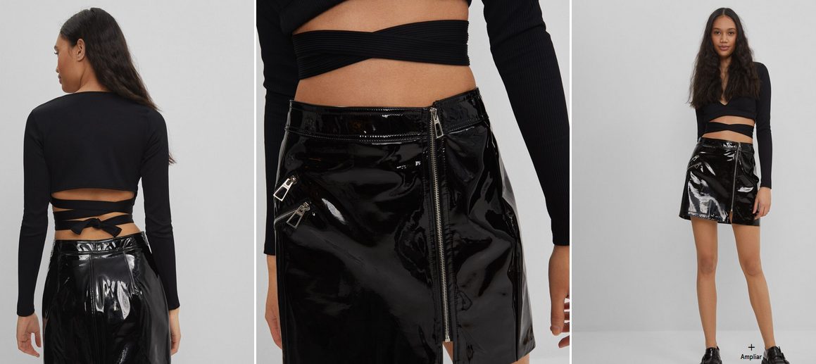 Ya puedes lucir de la manera más atractiva y original con estas faldas de vinilo que puedes encontrar en Bershka. Lo más destacado es que viene con un descuento del 80% y solo te vale 3,99 euros. Las puedes tener en negro y rojo. Un look perfecto de mujer poderosa con el que vas a llamar la atención de todos los que te rodean. Como puedes ver el look completo de la modelo con el top de la imagen es ideal.