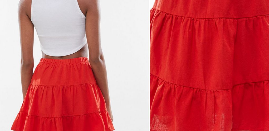 Si eres una amante de las faldas más clásicas, Bershka también tiene este modelo que está arrasando entre sus clientas. Se trata de una falda con volantes en algodón y lino. Por solo 3,99 euros después de tener un descuento del 75%, ya que antes valía casi 17 euros. La tienes en color rojo, que es una maravilla, y en crudo. Un look muy juvenil que puedes combinar con un top de tirantes y unas zapatillas deportivas.