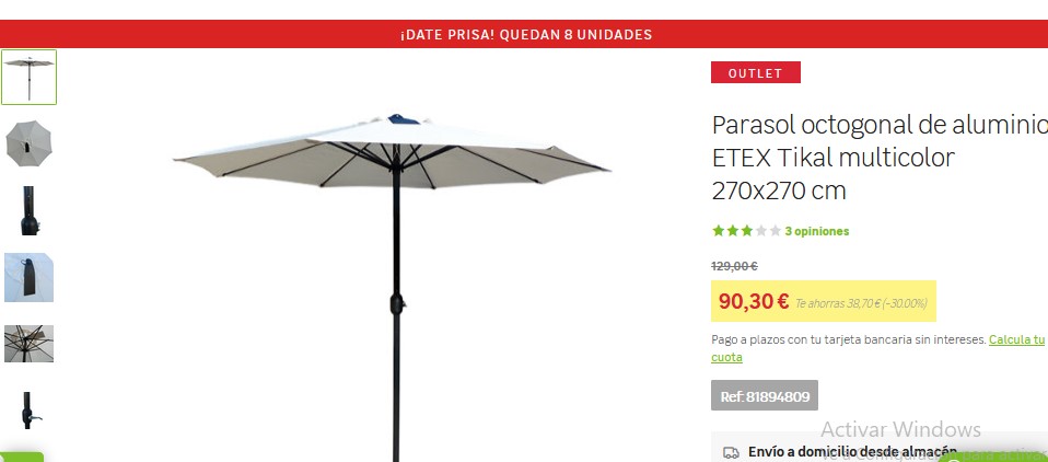 Este parasol octogonal se caracteriza por estar diseñado en la parte central de aluminio, varillas de aceros y telas de poliéster de color blanco y gris. inclusive, es perfecto porque es sostenible, ya que tiene dos salidas de puertos USB-Dual. Por lo que, permite cargar dispositivos electrónicos mediante paneles solares y la energía se acumula en una batería de litio. Esta se puede abrir o cerrar con manivela de manera cómoda y segura, se debe de cerrar en los casos de lluvia para que no se dañe. Si la deseas obtener solo debes entrar a Leroy Merlín por un precio de 90,30 €.