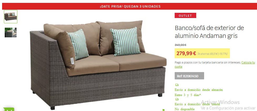 Es un sofá para el exterior por lo que se puede usar en los jardines o terrazas. Son fabricados en aluminio y están recubiertos de ratán sintético. Inclusive, están trenzado de color gris perfecto para dos personas; tiene incorporado apoyados brazos en los lados derecho para favorecer la comodidad de las personas. Tiene incluido unos hermosos cojines desenfundables hechas de poliéster relleno de completamente de fibras. Si la deseas obtener solo debes entrar a Leroy Merlín por un precio de 279,99 €.