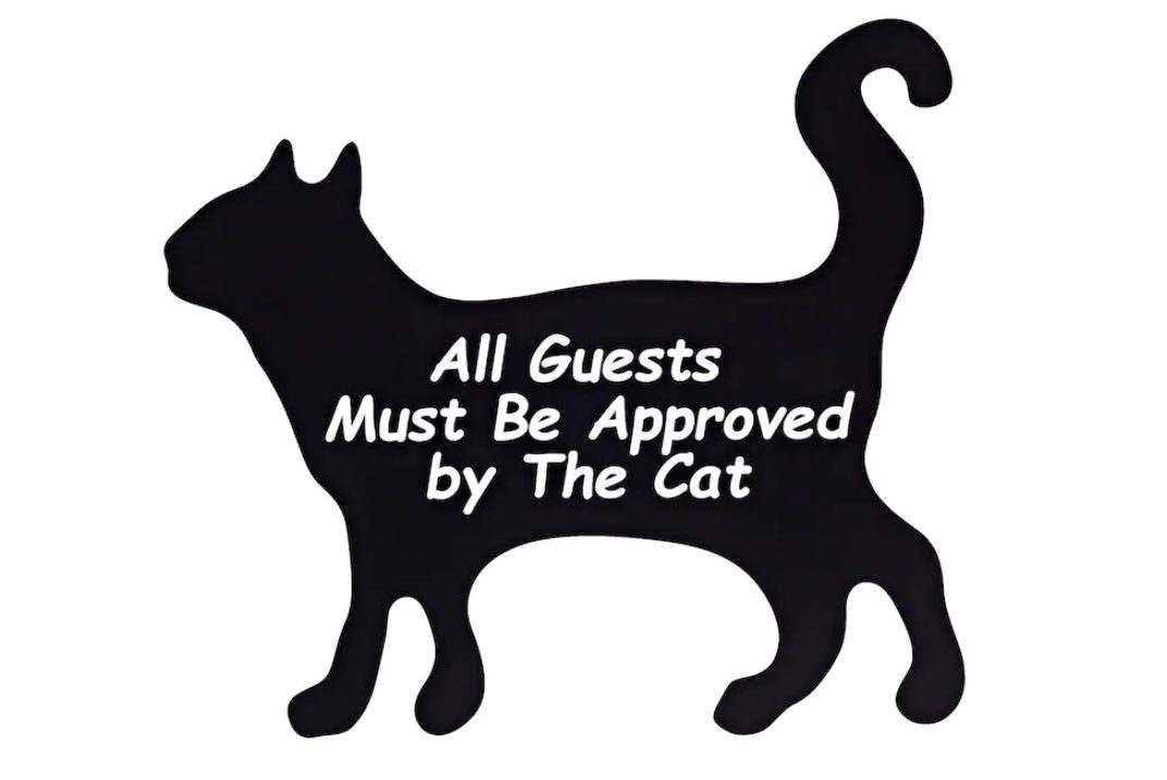 En este pequeño cartel, de 37×33 cm de ancho, leemos «Todos los invitados deben ser aprobados por el gato», en inglés. Sin duda, una nota de humor que a todos les encantará y que podemos colocar en un lugar que se vea nada más entrar.