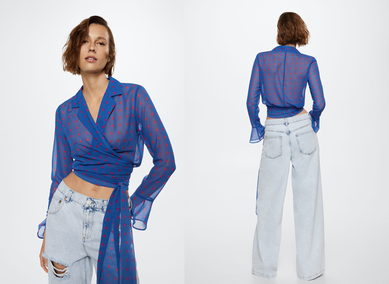 Entre las últimas novedades en llegar a Mango se encuentra esta blusa semitransparente lunares, interesante modelo en color azul con detalles en rojo que se vende por 29,99 euros. Es una prenda confeccionada en 100% poliéster.