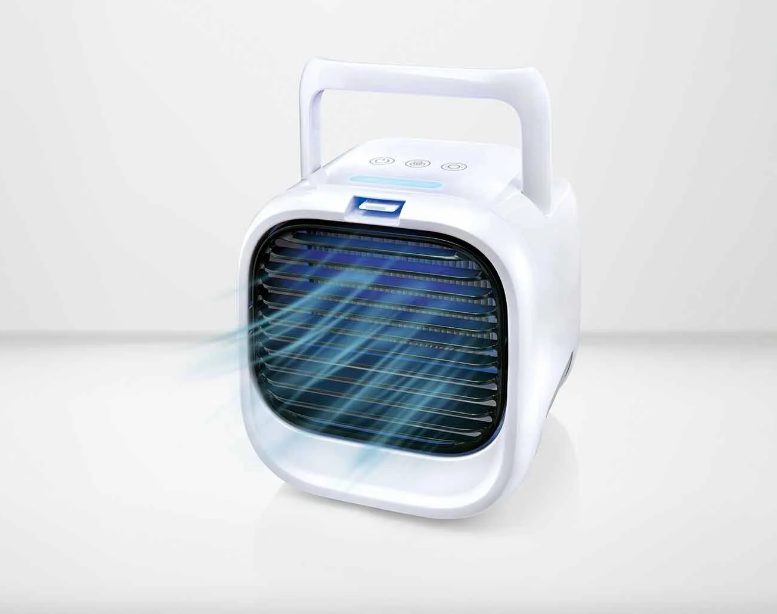Refresca el ambiente y humidifca el aire de forma muy agradable con este pequeño mini enfriador de 8 W, fácil de transportar a cualquier sitio. Tiene un asa incluida para mayor comodidad y cuenta con conexión USB C. Además, incorpora un depósito de agua que se puede rellenar con cubitos de hielo para un mayor efecto refrescante. Tiene una autonomía máxima de 7 horas y su precio es de 22.99€.
