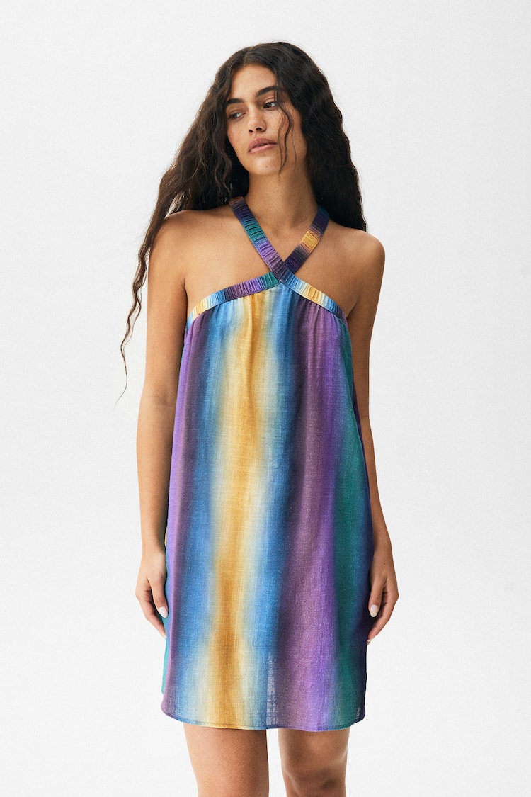 El cuello halter es uno de los más buscados la temporada de verano debido a que favorece a todas. Por este motivo, una de las prendas que no podrá faltar en tu armario es este vestido de Pull&Bear. De corte mini y estampado multicolor, muy divertido, podrás combinarlo con todo para crear un look especial. Además, lo tienes disponible por solo 18,19 euros cuando su precio anterior era de 25,99.