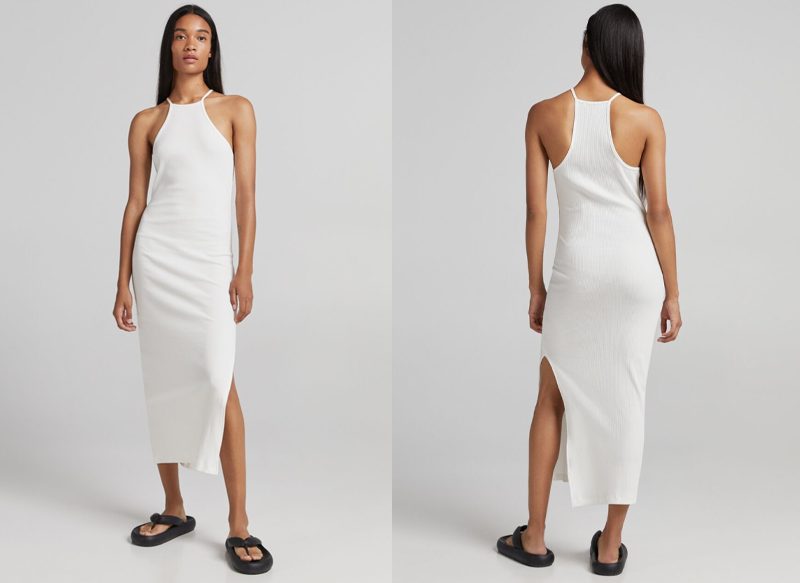 La firma del grupo Inditex cuenta en su catálogo con este vestido largo rib, un modelo que está a la venta por 12,99 euros en color blanco roto, negro y marrón; y que se encuentra disponible en tallas XS a XL. Es un modelo largo con abertura lateral y sin mangas que es muy versátil.