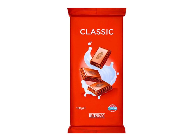 Mercadona tiene en el mercado múltiples opciones en lo que respecta a su chocolate para encontrar opciones como esta tableta Hacendado Classic, un chocolate con leche comercializado en formato de 150 gramos por un precio de 0,65 euros.