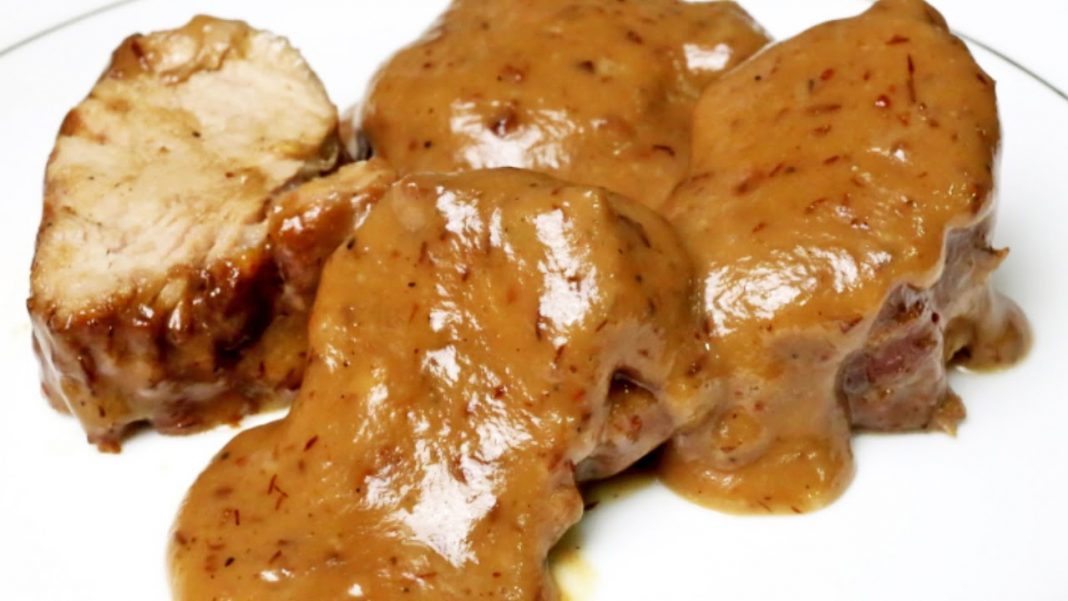 Pasamos ya a la carne, y vamos a comenzar con un solomillo que es una carne que suele gustar a todo el mundo. Sobra decir que hay mil formas de preparar un solomillo, pero nosotros nos vamos a decantar por este solomillo a la mostaza porque con la Thermomix se convierte en un plato de principiante, y que podemos preparar con antelación para no tener que «meternos en faena» justo cuando los demás están disfrutando de un buen vino. Mete en el vaso de la Thermomix un par de cebollas con 50ml de aceite de oliva 10 segundos a velocidad 4. Baja la velocidad a 1 y añade una cucharadita de maicena, 50ml de vino blanco, 100ml de caldo de ave. Cierra y deja 10 minutos a velocidad 2. Cuando esté listo añade 30 gramos de mostaza de Dijon durante un minuto a 7 de velocidad y por último salpimienta. Ya sólo te queda dorar el solomillo justo cuando llegue la hora de la cena, y servir la salsa caliente en una salsera a parte.