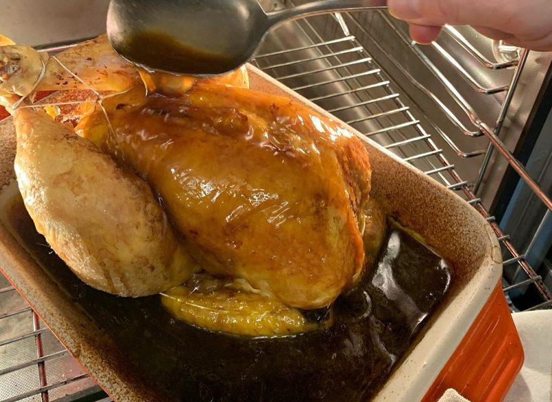 Luego pon una gran parte de la «cerveza» en la bandeja del pollo y vuelve a meter en el horno a 190ºC durante una hora más. Seguidamente tendrás que ir regando el pollo cada poco tiempo con el jugo que este vaya soltando y con la cerveza.