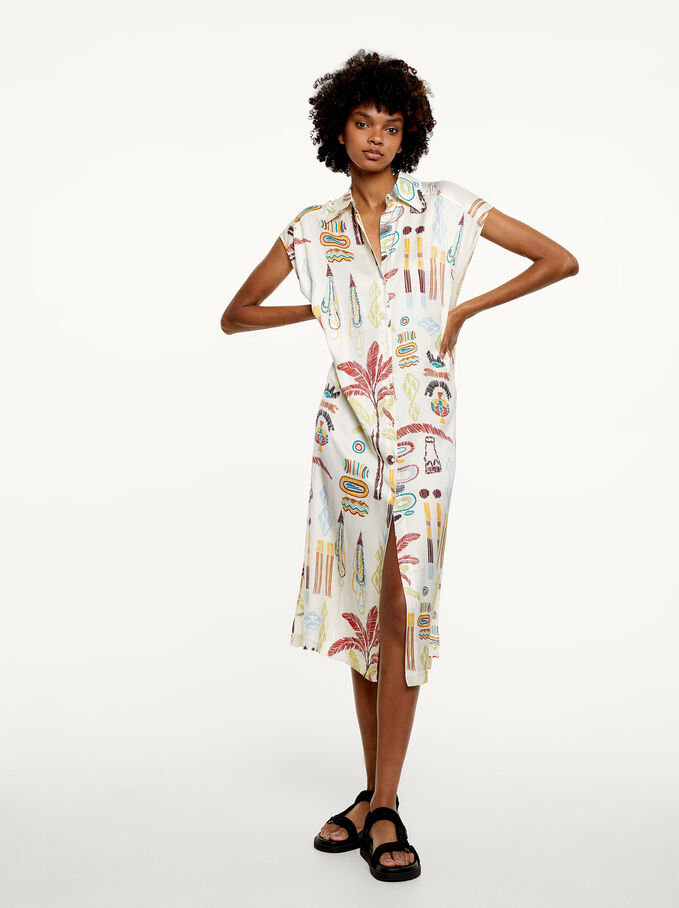 Los vestidos camiseros se van a convertir en otra de las grandes apuestas del verano. En este caso, uno de los que más destacan es este, de corte midi, gracias a su tono neutro y llamativo estampado. Apto para llevar en el día a día por su comodidad, lo puedes conseguir ya en la tienda por tan solo 35,99 euros. Sin duda, será una buena inversión.