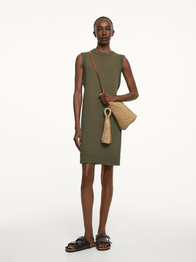 El punto es uno de los tejidos que sin duda no pueden faltar en tu armario de verano. Por eso, este bonito vestido sin mangas y de corte mini se convertirá en tu mejor aliado a la hora de hacerle frente al calor. Otra de las cosas por las que llama la atención es su color, un bonito verde militar que queda bien con todo. Además, te puedes hacer con él por 35,99 euros.
