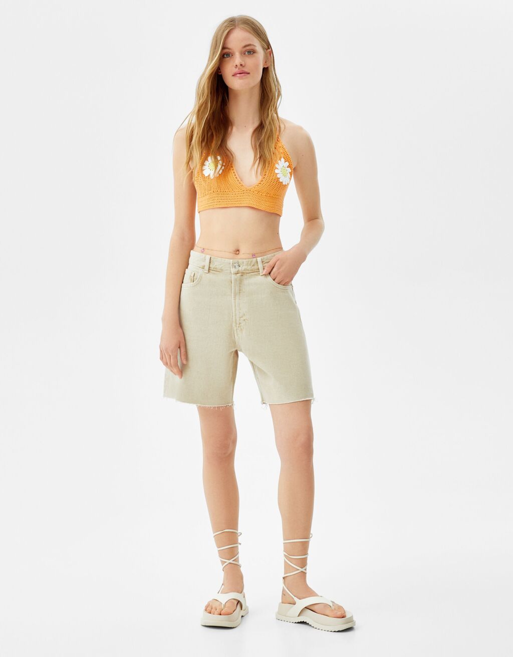 El color crudo es otro de los favoritos del verano debido a su capacidad para combinar con todo y porque no deja de ser un tono clar que aporta alegría al conjunto. En este caso, destacan en Bershka estas bermudas de carácter vintage que se convertirán en uno de eso básicos clásicos que debes tener en tu armario. Su precio, de solo 22,99 euros, también convence.