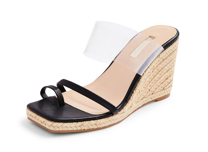 En lo que a opciones de calzado se refiere dentro de catálogo de Primark, nos encontramos con estas sandalias de cuña negras con tira transparente. Se trata de unas sandalias que se encuentran disponibles en varios acabados y su precio de venta es 18 euros.