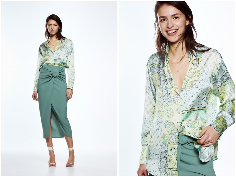 En el final de esta lista de blusas que tienes disponibles en el catálogo de Zara con otros modelos, elegimos una blusa satinada color verde y crudo que tiene un precio de 19,95 euros. Confeccionada 100% poliéster. Es bastante fluida, de cuello solapa con escote pico y manga larga. Cierre frontal con botones. Si quieres hacerte con este diseño, aquí vas a poder encontrarla.
