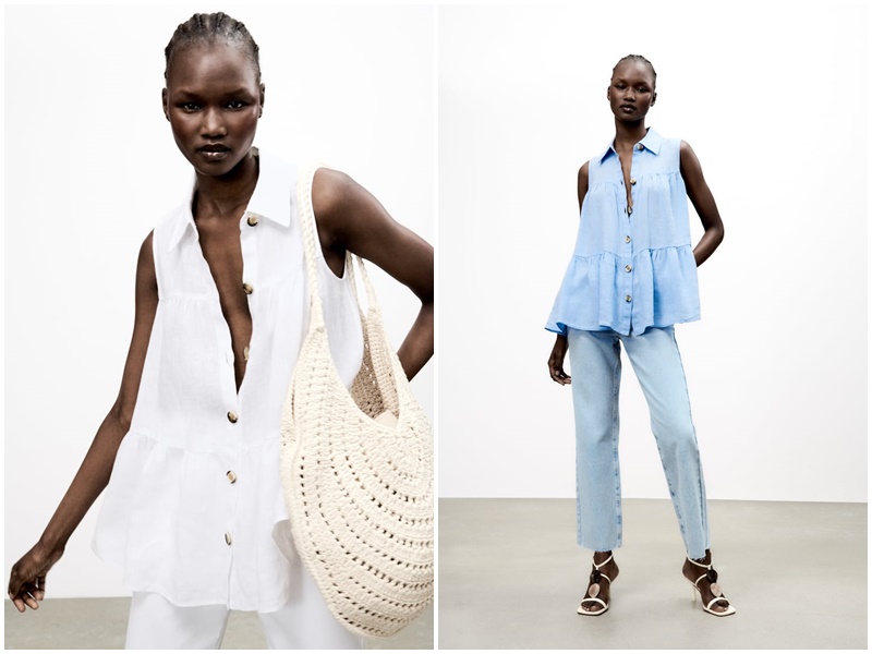 Seguimos con esta lista de blusas que tienes disponibles en el catálogo de Zara con otros modelos. En este caso elegimos una blusa lino paneles sin mangas que tiene un precio de 25,95 euros. Este es otro de los diseños que puedes encontrar disponible en dos colores: blanco o celeste. Tiene el cuello solapa, manga sisa, y cierre frontal con botones. El material es 100% lino. Si quieres hacerte con este diseño, aquí vas a poder encontrarla.