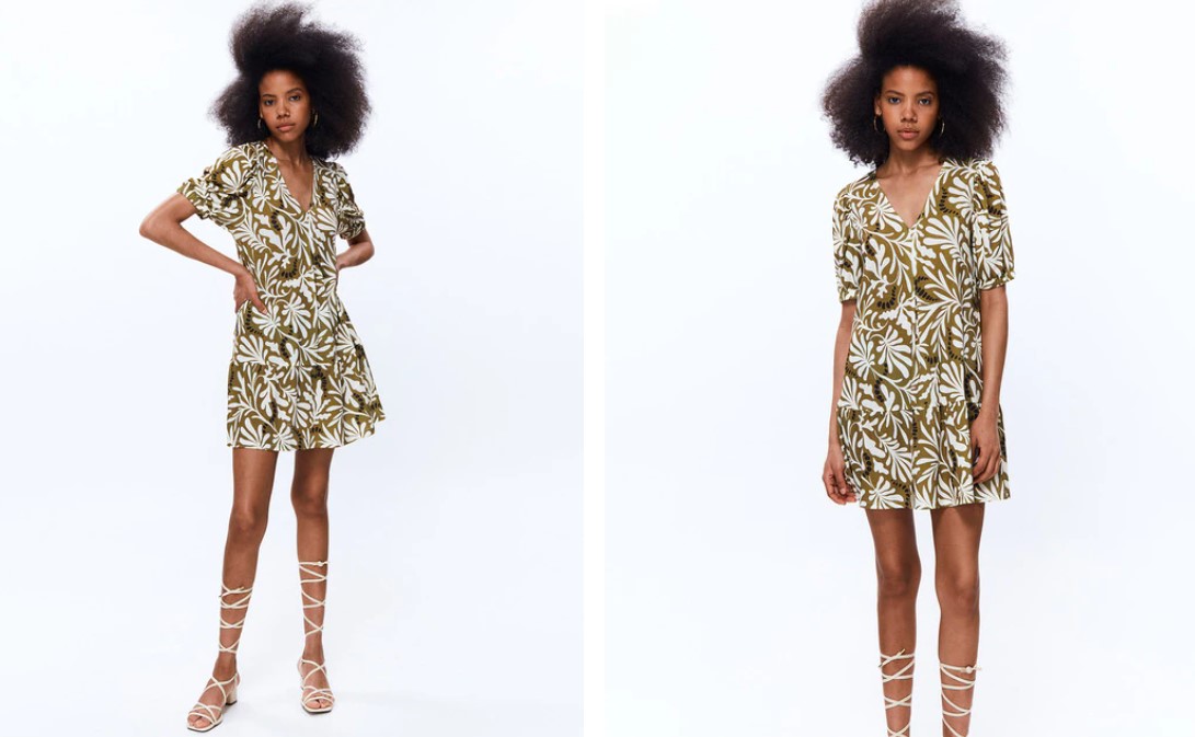 Este otro vestido corto de cuello pico y manga amplia con estampado tropical, también podrás encontrarlo en la página web de El Corte Inglés. Está disponible en tres colores: verde, multicolor y negro. Es ideal para ir a trabajar o una ocasión especial, para salir, cenar, aperitivo, y hasta de look de invitada de boda. Elige unos buenos accesorios, zapatillas blancas o sandalias planas o de tacón de tiras finas y un bolso de fiesta. Este modelo tiene un costo de 17,99 euros.