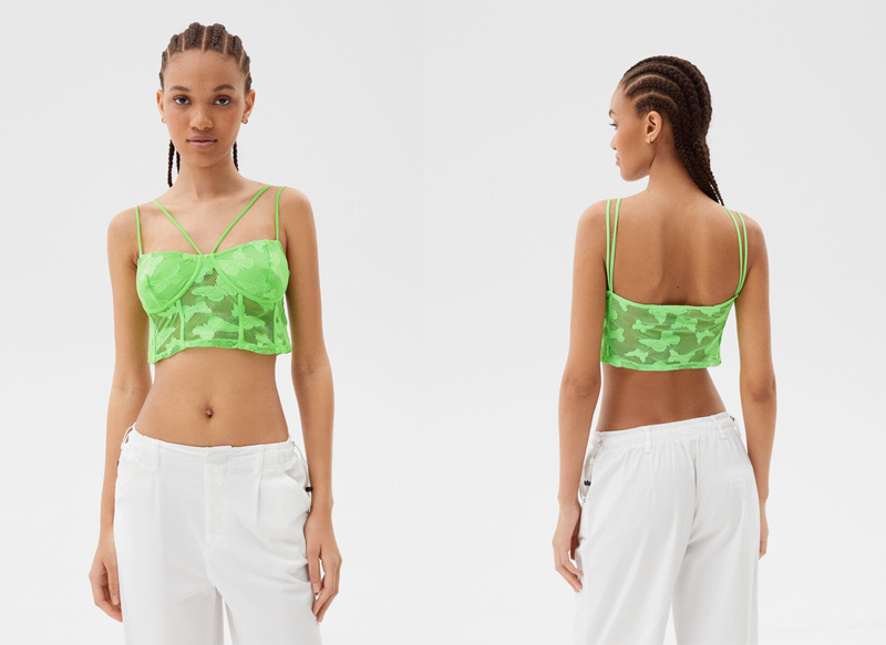 Una última recomendación es este top corsé tul jacquard, un interesante modelo en un color llamativo verde fluor que puede ser el toque de color perfecto para tus looks en esta primavra y verano.