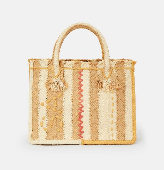 Las cestas de rafia son pura esencia de verano, así que esta temporada no puede faltar un bolso de este tipo en tu colección. Esta es de la marca Sans Arcidet, y destaca por su tamaño discreto, 15 (ancho) x 30 (fondo) x 24 (alto) cm y su diseño a rayas. Tiene una original combinación de colores en natural y dorado, con un detalle en rojo. Es una cesta de mano, con un nada doble y un bolsillo interior de algodón. Es de rafia 100% y su precio es de 150 €. Si te gusta puedes pedirlo aquí.