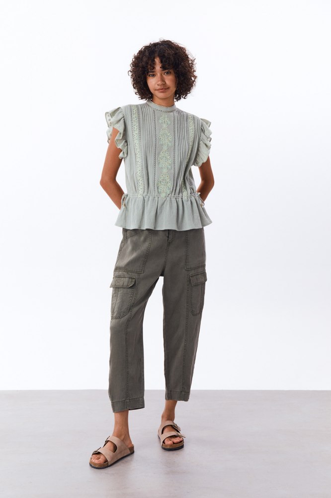 Bordados, jaretas y diseño casual a la vez que sofisticado. Esta blusa de Sfera sabe coompaginar a la perfección la sencillez con la elegancia para convertirse en la favorita de este verano. Además, cuenta con unos bonitos tonos verde pálido que la harán combinar con el resto de tus prendas. Su precio, de tan solo 23,99 euros, también convence.