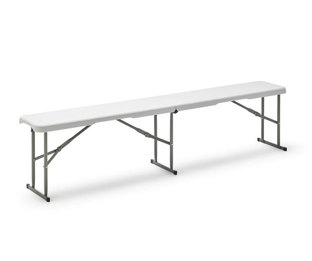 Este banco plegable es un mueble versátil y muy práctico, que se puede utilizar en exterior o en interior para todo tipo de usos. Como asiento, como mueble supletorio, para colocar macetas o almacenar artículos… La estructura es metálica y el asiento es de poliestireno. Se puede plegar y lleva un asa incorporada para un transporte fácil. Además, lleva un cierre de seguridad para evitar que se pliegue mientras estamos sentados. Soporta hasta 350 kg y mide 180 (ancho) x 28 (fondo) x 43 (alto) cm es de color blanco y tiene un precio de 39,95€. Si te interesa, este es el enlace.